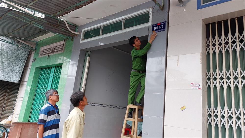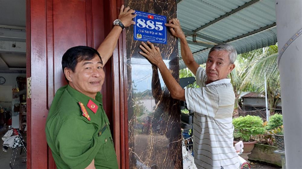 Công an xã Vĩnh Thới, huyện Lai Vung cấp biển số nhà cho người dân.
