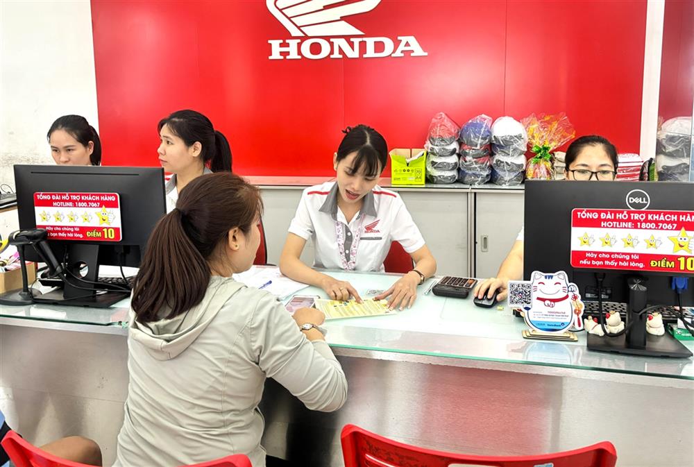 Cửa hàng kinh doanh xe máy hướng dẫn khách hàng đăng ký xe bằng dịch vụ công trực tuyến toàn trình.