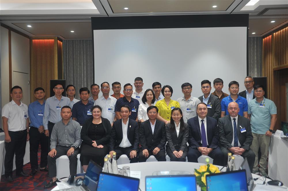 Đại tá Lê Thơm, bà Tan Li Xian Tricia chụp ảnh lưu niệm cùng các chuyên gia và các đại biểu tham gia khóa tập huấn.