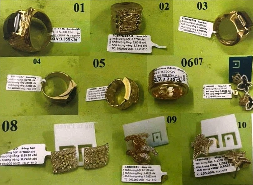 Số nữ trang gồm 40 chiếc nhẫn, bông tai, dây chuyền các loại có kiểu dáng, chất liệu theo 12 kiểu nhẫn, bông tai, dây chuyền có đặc điểm cụ thể như hình bên dưới